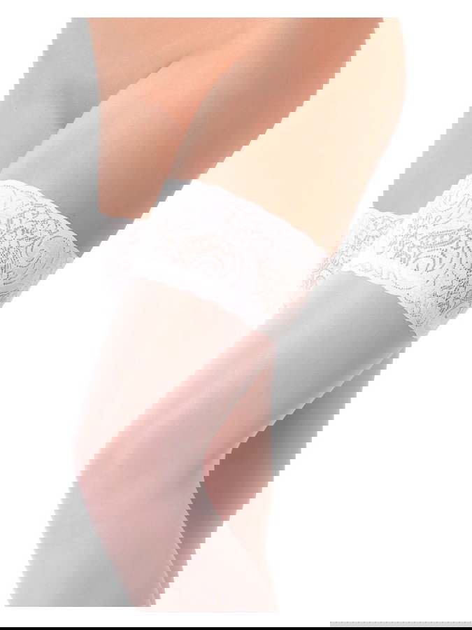 Diese Strümpfe sind oben mit Spitze verziert und bleiben dank des Silikons auf der Innenseite an Ort und Stelle.