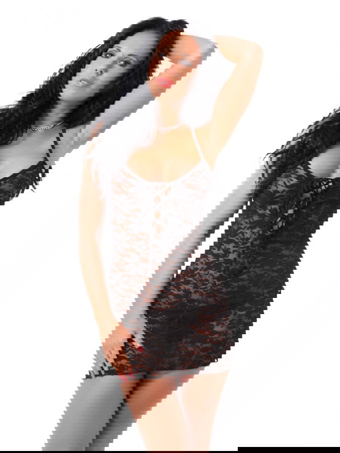 Dieses Kleid ist aus weicher, elastischer Spitze gefertigt. Vorne und hinten hat das Kleid einen Spitzenverschluss.