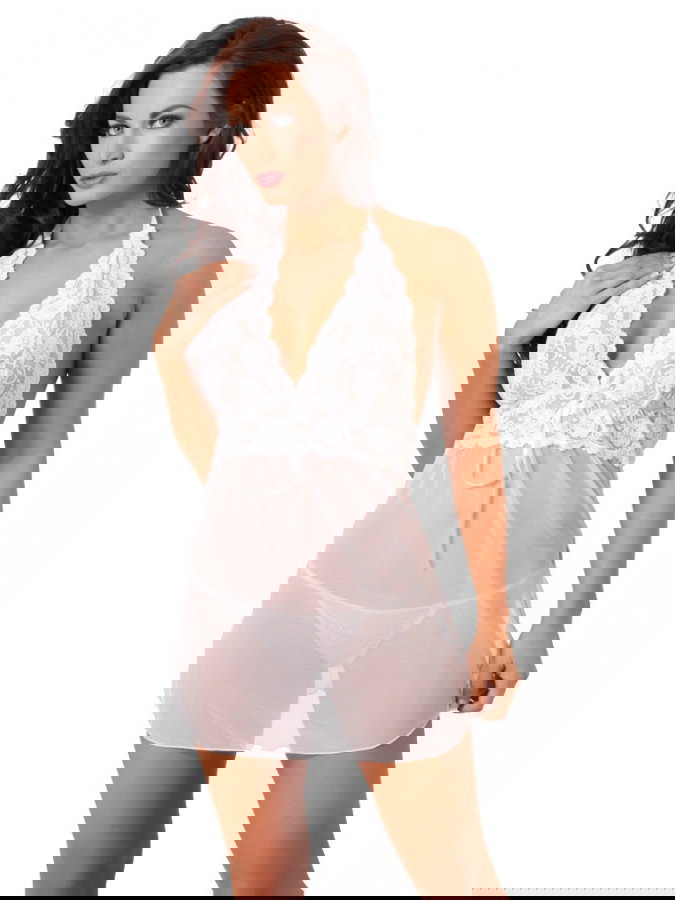 Dieses Set besteht aus dehnbarem, durchscheinendem Stoff und ist mit Spitze und Bändern verziert. Das Kleid hat einen Neckholder-Ausschnitt und einen offenen Rücken.