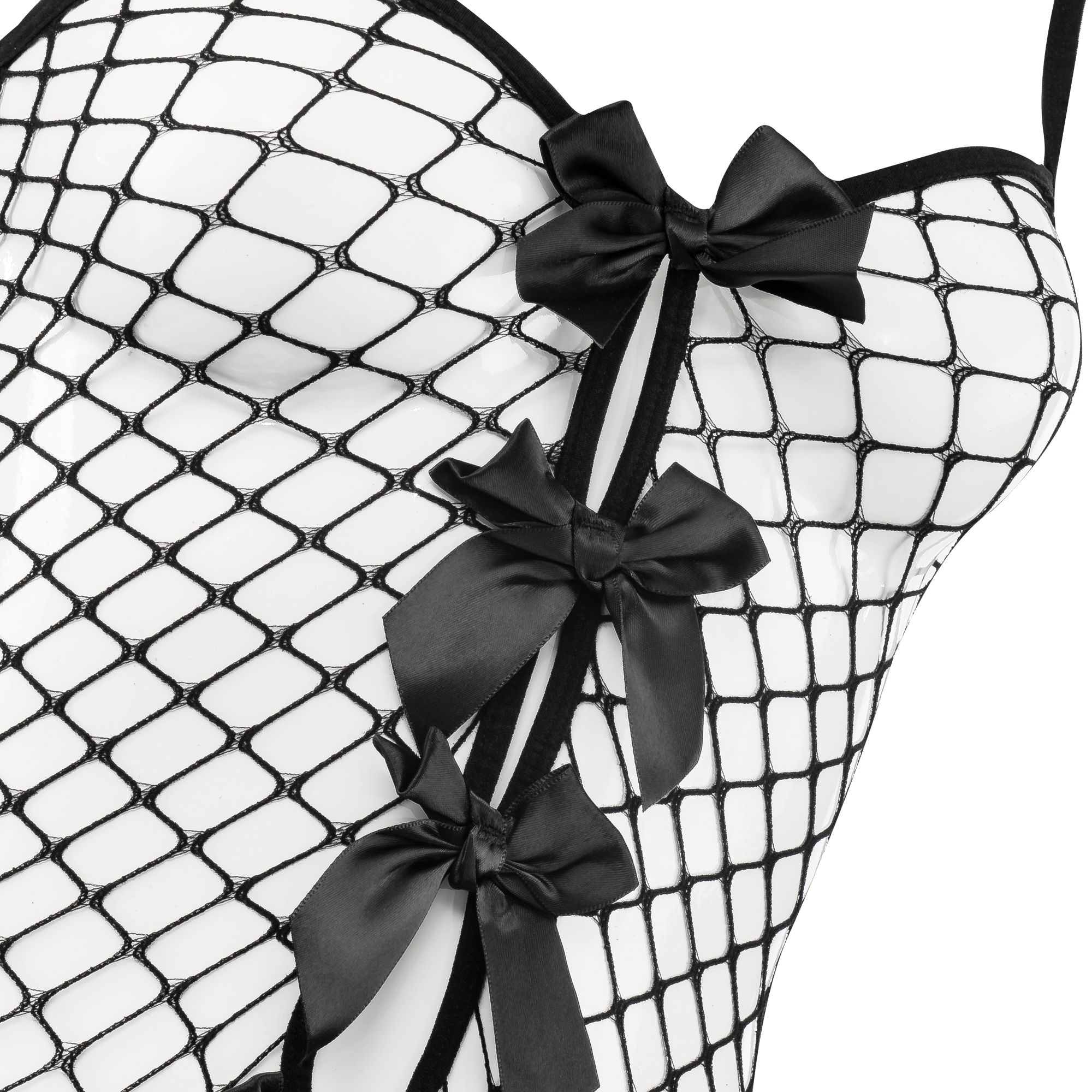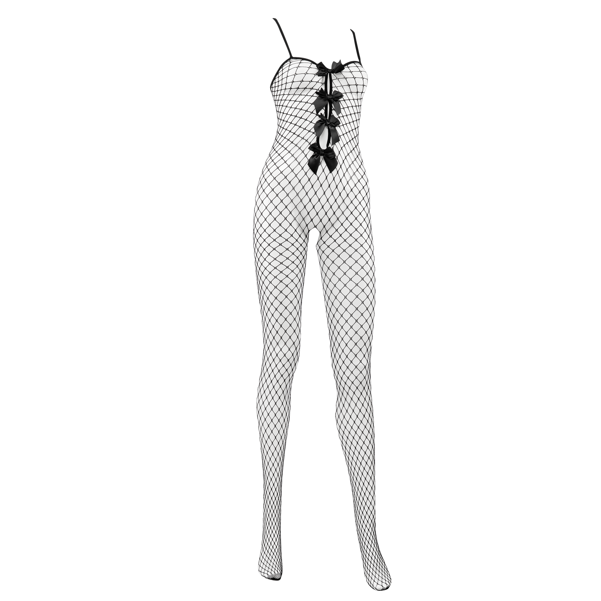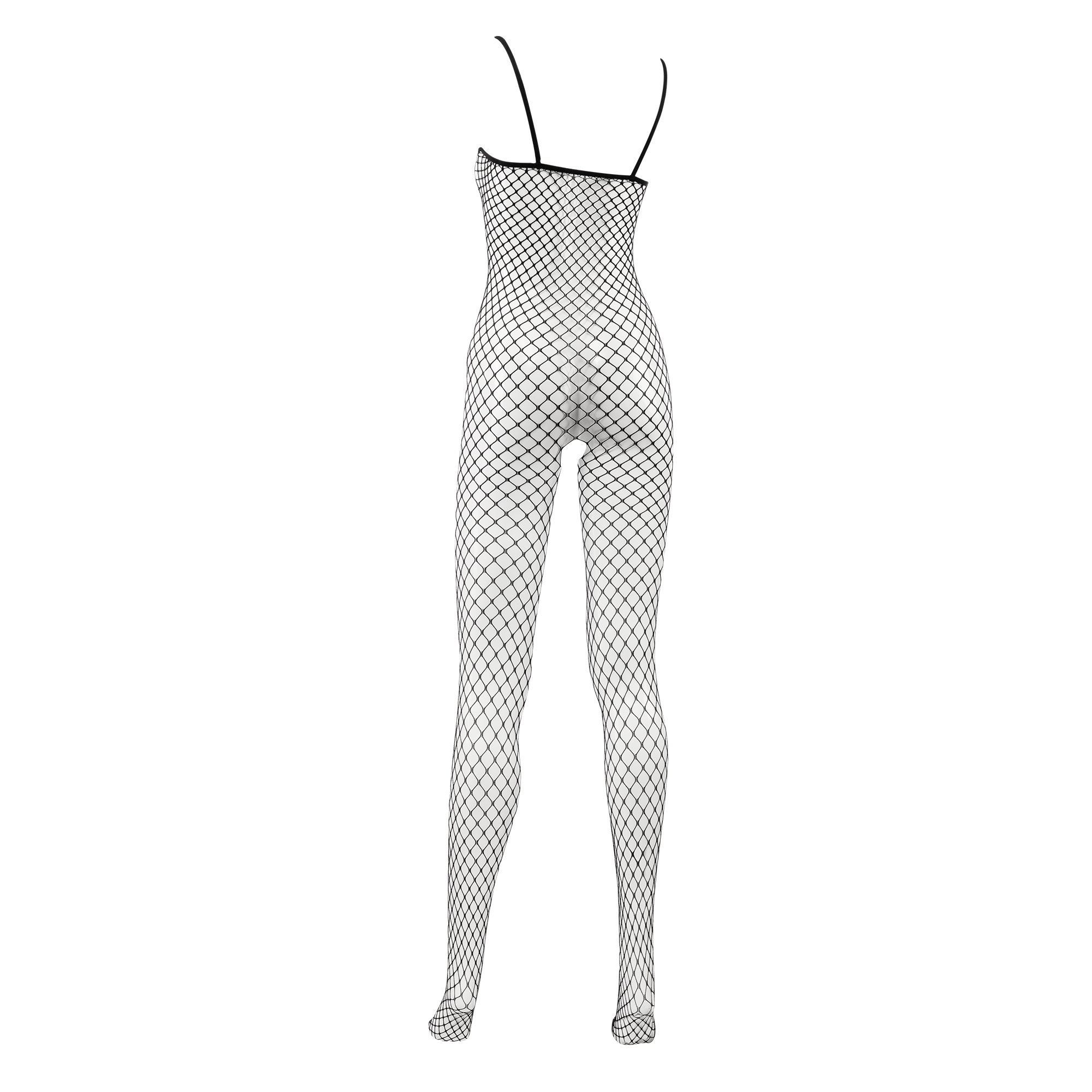 Dieser Catsuit besteht aus dehnbarem Netzstoff und hat einen offenen Schritt.