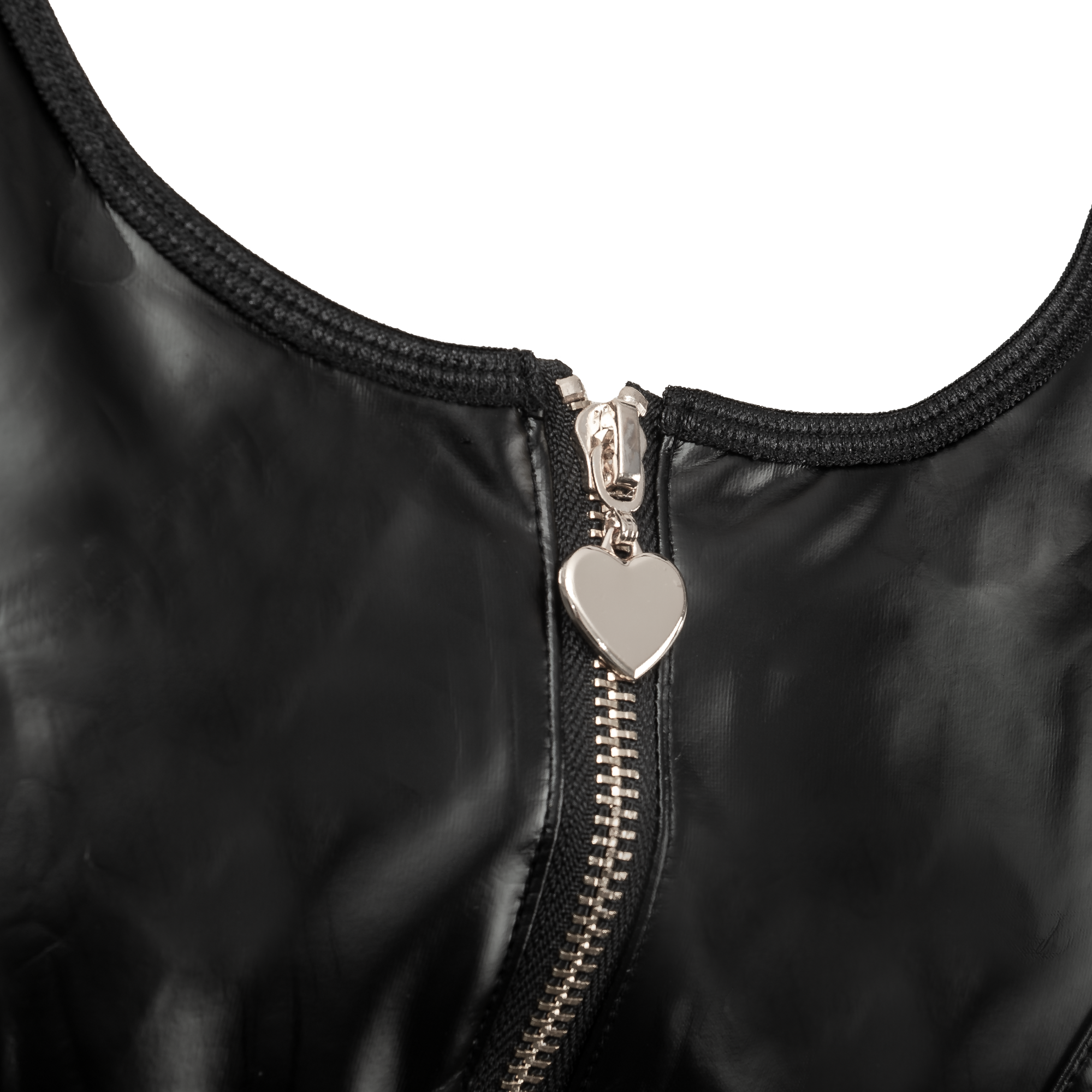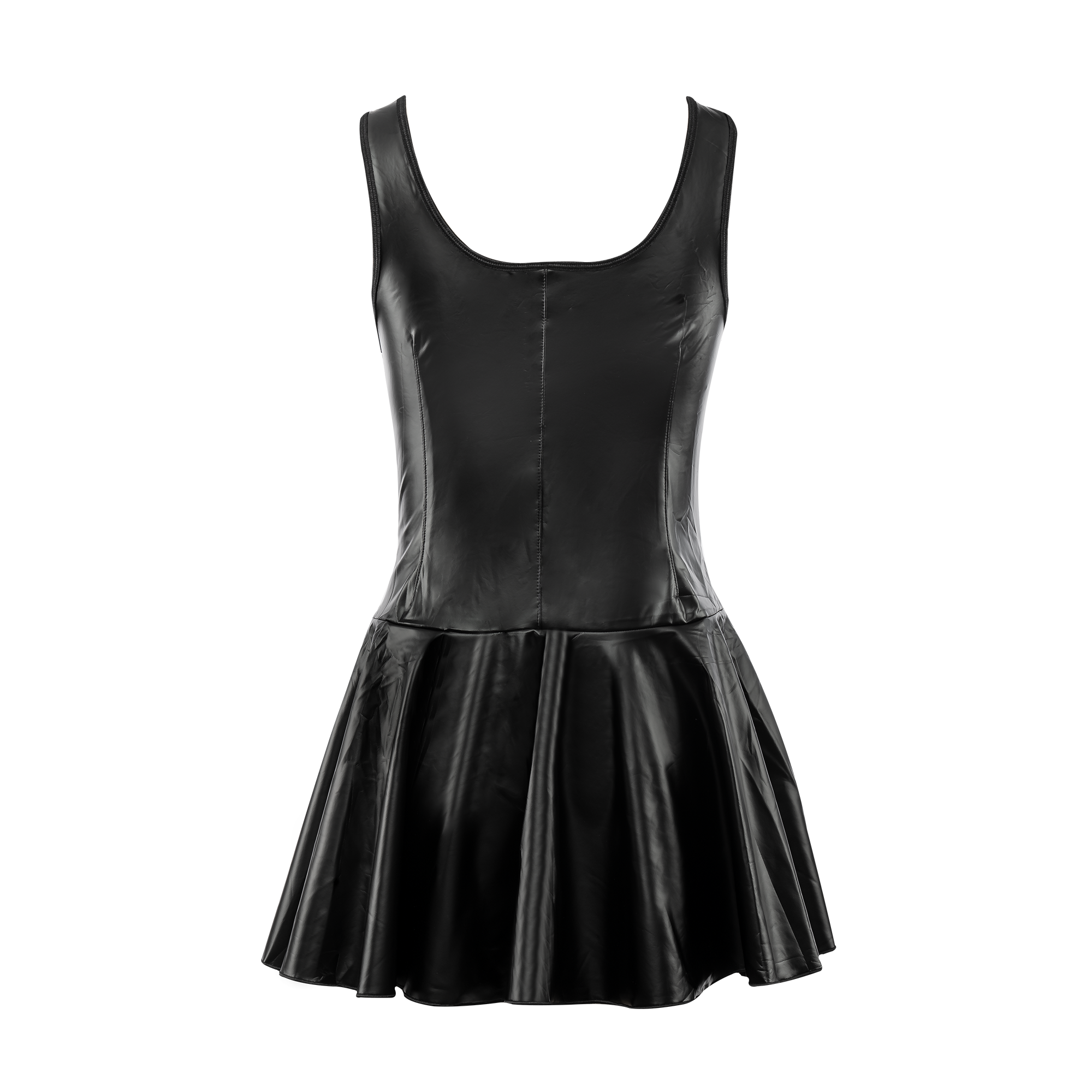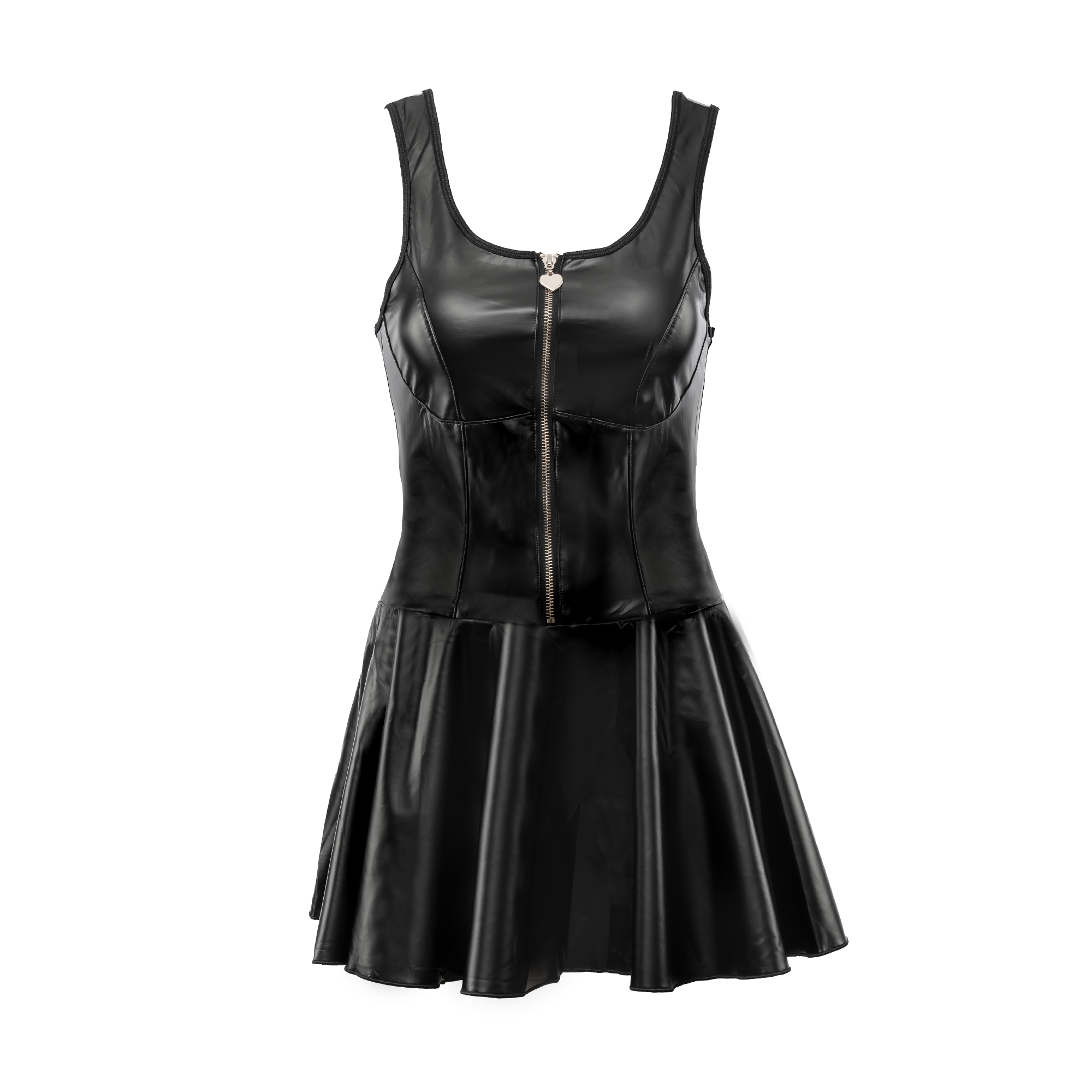 Dieses Kleid besteht aus dehnbarem Wetlook-Material und hat einen goldenen Reißverschluss vorne.