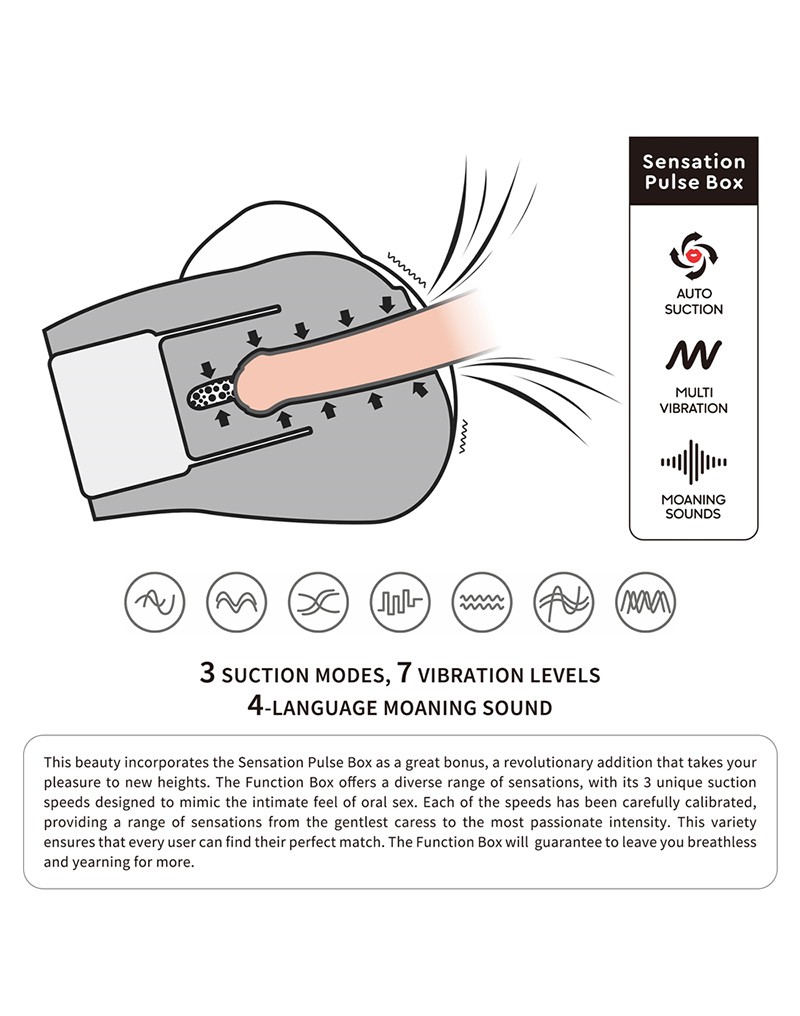 Mit der Integration von realistischen Stöhngeräuschen und 7 Vibrationsfrequenzen geht diese Sensation Pulse Box noch einen Schritt weiter, um ein wirklich überwältigendes Erlebnis zu gewährleisten, das bei jeder hautfreundlichen Erfahrung unwiderstehliche Lust hervorruft.