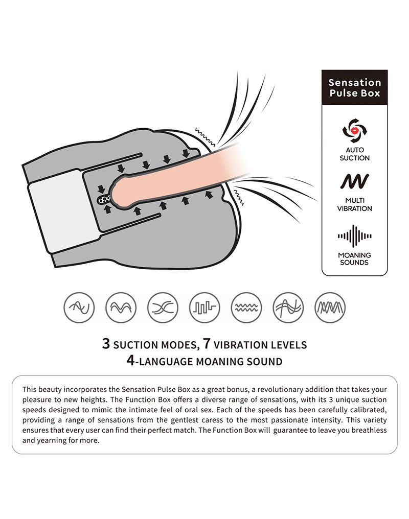 Mit der Integration von realistischen Stöhngeräuschen und 7 Vibrationsfrequenzen geht diese Sensation Pulse Box noch einen Schritt weiter, um ein wirklich überwältigendes Erlebnis zu gewährleisten, das bei jeder hautfreundlichen Erfahrung unwiderstehliche Lust hervorruft.
