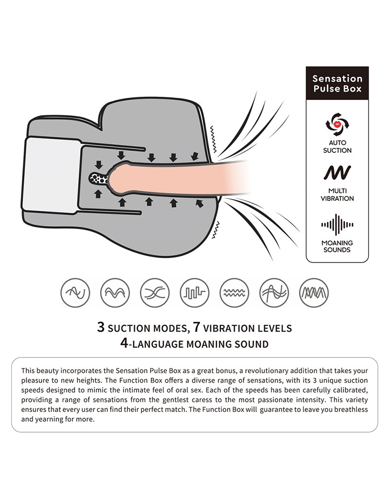 Mit der Integration von realistischen Stöhngeräuschen und 7 Vibrationsfrequenzen geht diese Sensation Pulse Box noch einen Schritt weiter, um ein wirklich überwältigendes Erlebnis zu gewährleisten, das bei jeder hautfreundlichen Erfahrung unwiderstehliche Lust hervorruft.