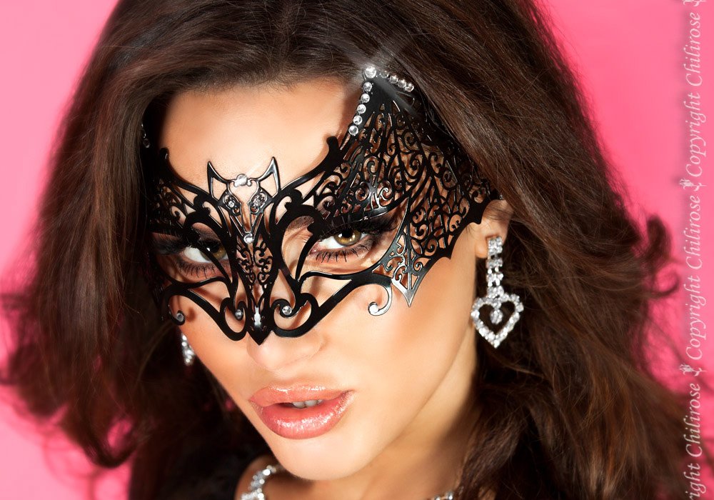 Diese geheimnisvolle Maske aus Messing ist verziert mit glitzernden Kristallen. Sie lässt sich mit Satinbändern festbinden und perfekt anpassen.