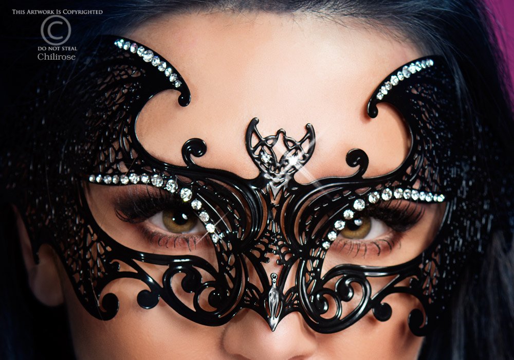 Diese geheimnisvolle Maske aus Messing ist verziert mit glitzernden Kristallen. Sie lässt sich mit Satinbändern festbinden und perfekt anpassen.