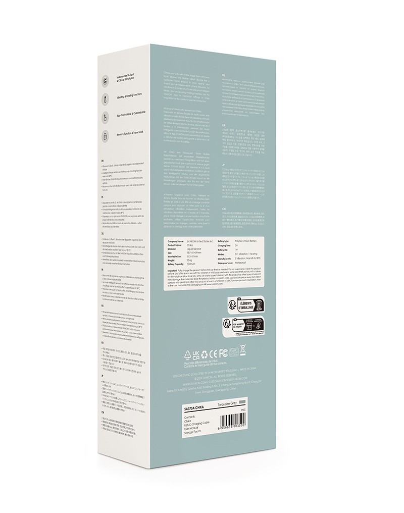 Der Chika ist mit einer Speicherfunktion ausgestattet, die den zuletzt verwendeten Vibrationsmodus wiederherstellt, einer Reisesperre, die ein versehentliches Einschalten verhindert, einer Batterieanzeige und einem USB-Ladeanschluss mit Staubschutzhülle. Chika ist außerdem wasserdicht, kann in der Badewanne oder Dusche verwendet werden und lässt sich leicht reinigen.