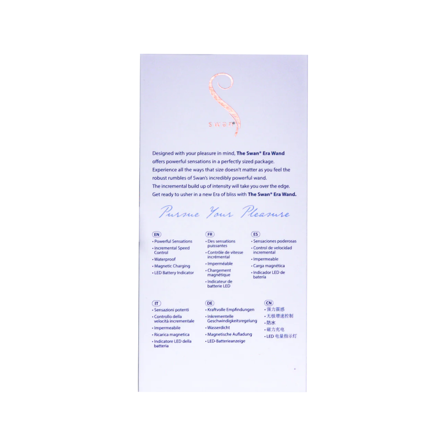 Mit dem Swan Era® Wand haben Sie kompakte Kraft immer zur Hand – klein genug, um diskret transportiert zu werden, leistungsstark genug, um Ihre Sinne zu verwöhnen.